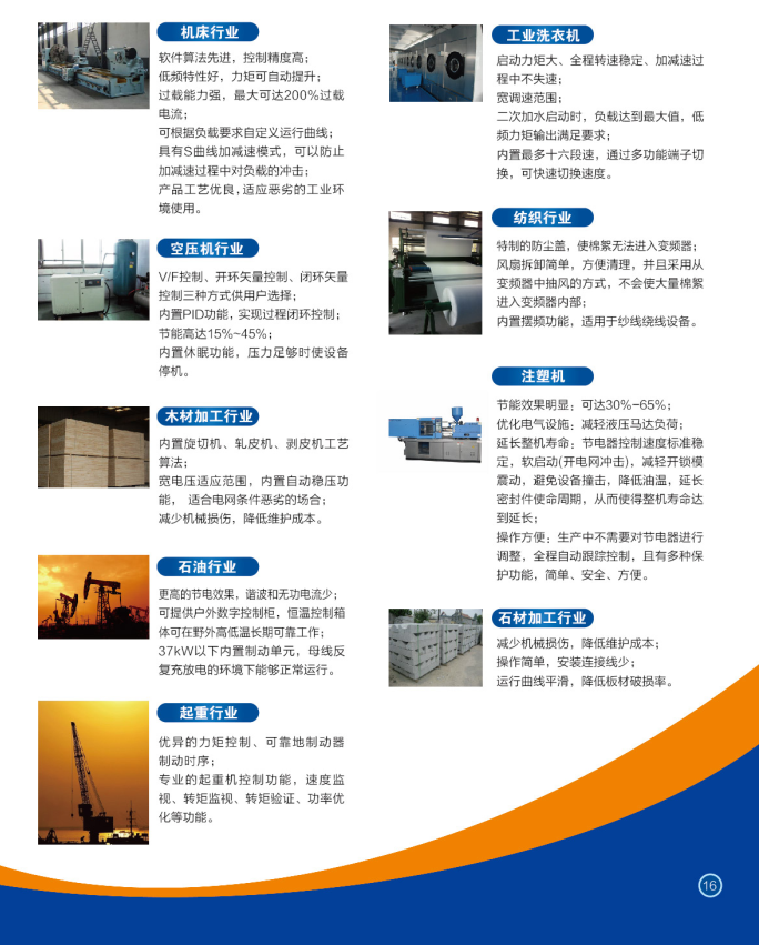 塑料和化纖擠出設備、機床行業(yè)、紡織行業(yè)、工業(yè)洗衣機、石油行業(yè)、建材、水泥、橡塑機械等多個(gè)行業(yè)。